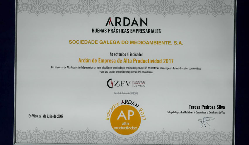Sogama recibe el Certificado Ardán de Empresa de Alta Productividad 2017